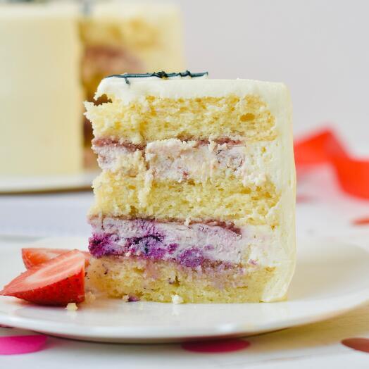 Внутри самая любимая начинка наших клиентов - ванильный бисквит с чернично-малиновым кремом из взбитых сливок и маскарпоне. Нежный, не приторный тортик, который обожают и взрослые, и дети.